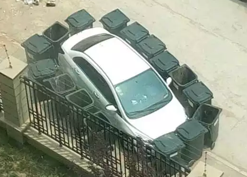 19日中午,青島杭州路中海臨安府南門外,一輛停在路邊的私家車被十幾個垃圾桶圍得“水泄不通”。“垃圾桶氣味大,被包得這么嚴實,真是醉了。”“這輛白色轎車到底惹了啥禍?要遭受這種待遇。”照片一經發布,立即引發網友熱議。